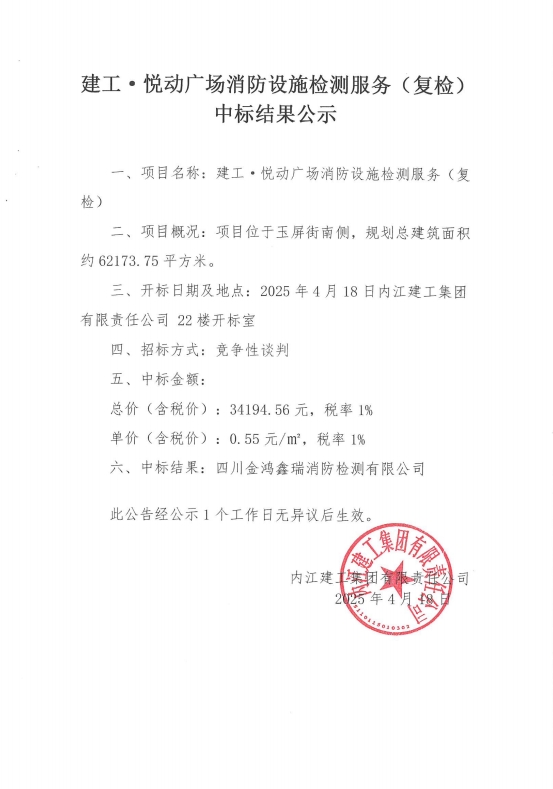 建工·悦动广场消防设施检测服务(复检) 中标结果公示