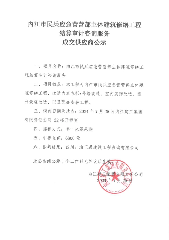 内江市民兵应急营营部主体建筑修缮工程结算审计咨询服务 成交供应商公示