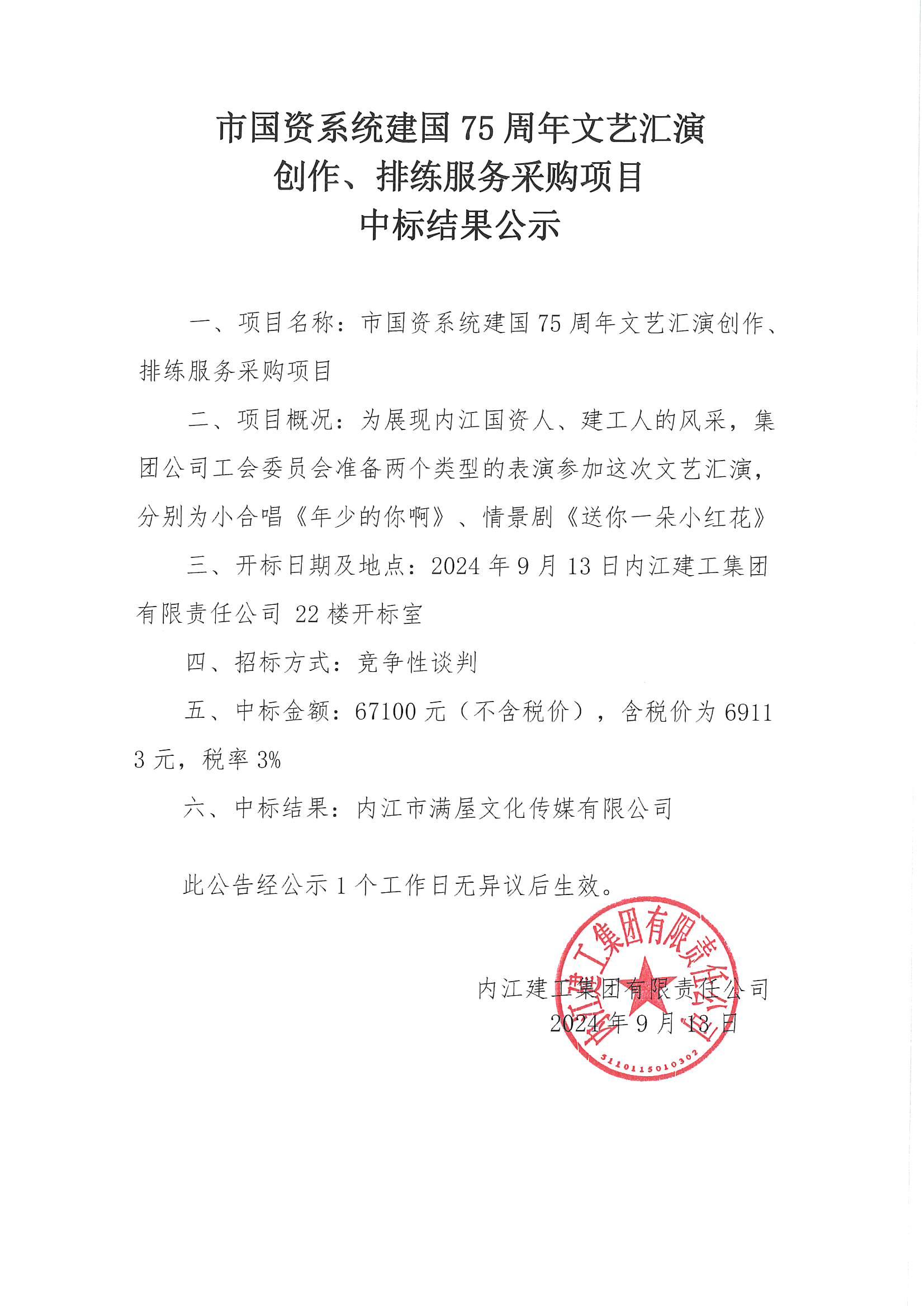 市国资系统建国75周年文艺汇演、创作、排练服务采购项目中标结果公示