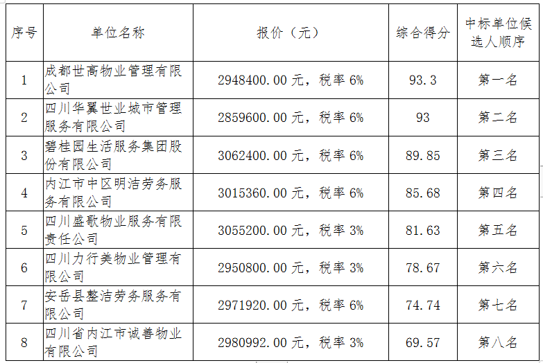 盛泰物业保洁服务外包公开招标 中标候选人公示