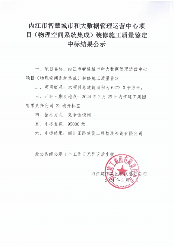 内江市智慧城市和大数据管理运营中心项目(物理空间系统集成)装修施工质量鉴定 中标结果公示