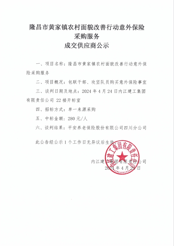 隆昌市黄家镇农村面貌改善行动意外保险采购服务 成交供应商公示