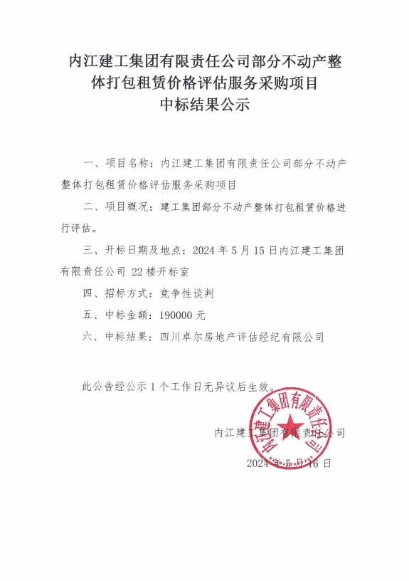 内江建工集团有限责任公司部分不动产整体打包租赁价格评估服务采购项目 中标结果公示